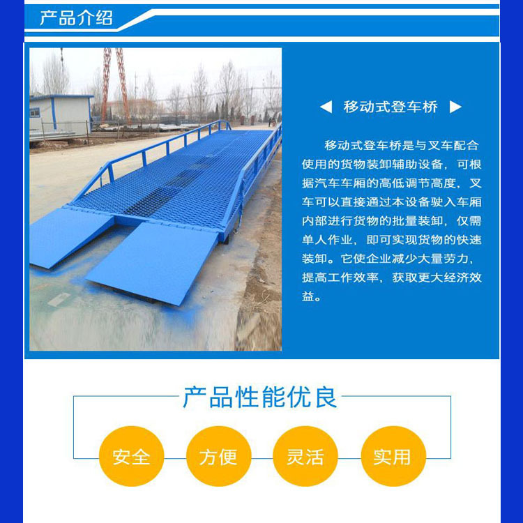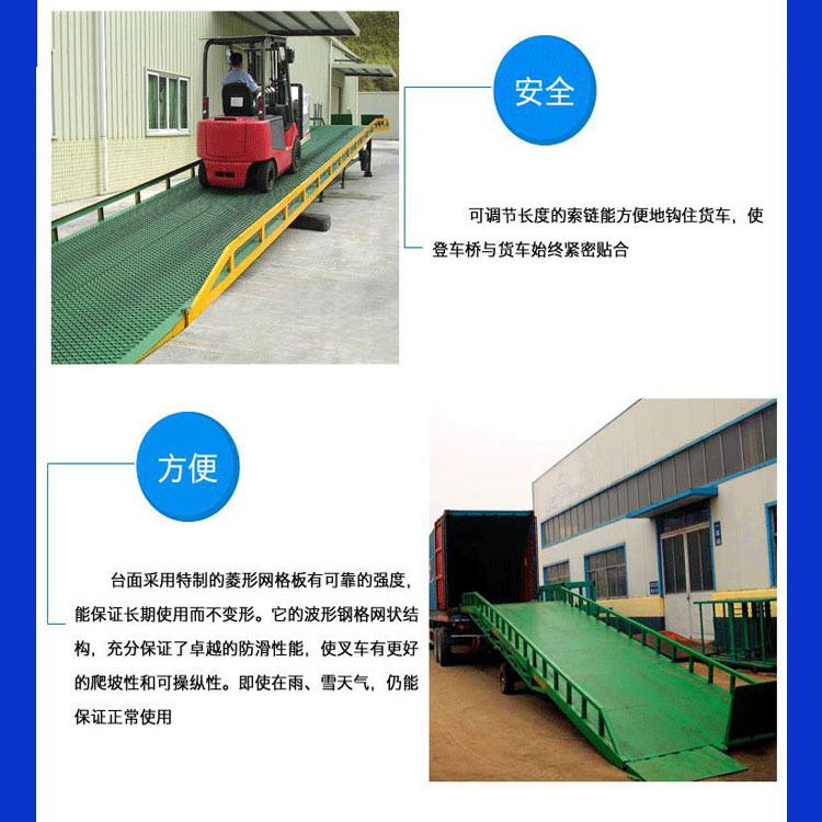 移動(dòng)式登車橋應(yīng)用于無裝卸站臺(tái)或裝卸位置不固定以及裝卸場(chǎng)地狹小等場(chǎng)合,實(shí)現(xiàn)了貨物快速裝卸。通過它使叉車等搬運(yùn)車輛直接進(jìn)入貨車、集裝箱、列車車廂裝卸貨物,大大的提高了工效。登車橋采用手動(dòng)液壓操縱,無需其它動(dòng)力,能適用于各種裝卸場(chǎng)合;登車橋采用支腿支撐和網(wǎng)格狀鋼板結(jié)構(gòu),有更可靠的安全性能。